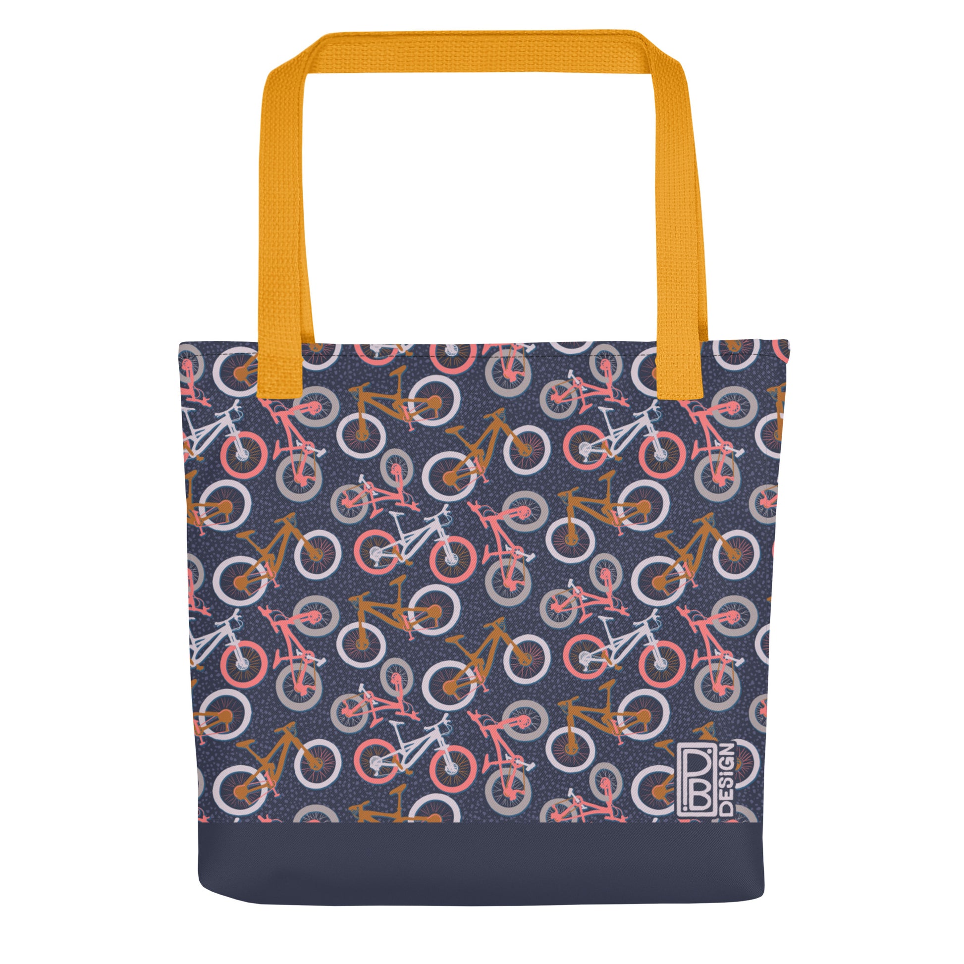 Show off your love for the trails—on and off the bike—with this bold and functional mountain bike tote bag.Featuring Paige Brady’s original hand-drawn mountain bike pattern in navy blue and pink, this 15 x 15 inch tote adds a splash of adventure to your everyday. The bright yellow handles give it a playful pop, while the sturdy, lightweight design makes it perfect for errands, trail snacks, or daily essentials.