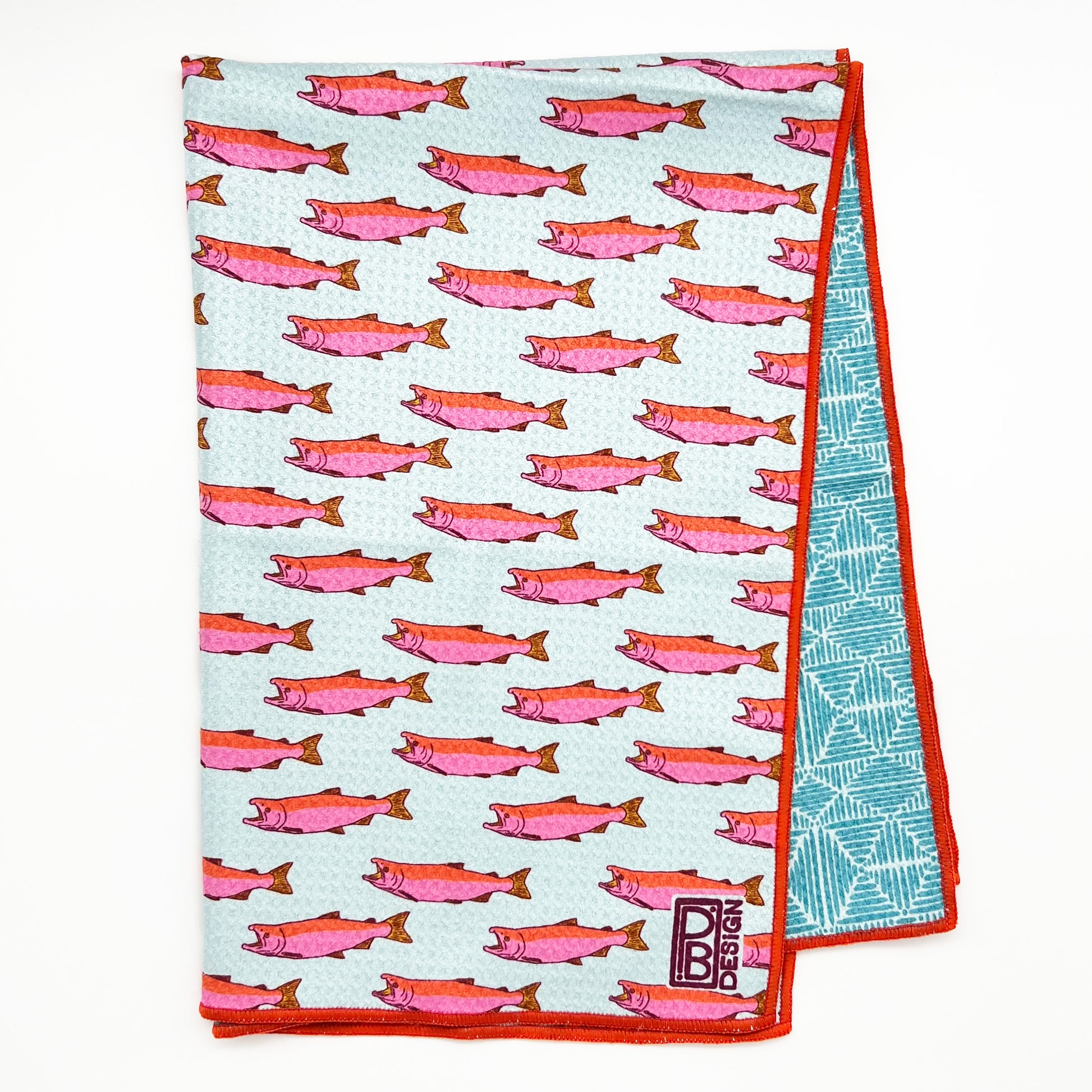 This waffle weave tea towel showcases Paige's hand-drawn simple salmon pattern, celebrating Alaska’s iconic fish in a clean, minimalist design. With its absorbent, quick-drying fabric, this towel combines functionality with a subtle touch of Alaskan charm, perfect for everyday use in your kitchen.