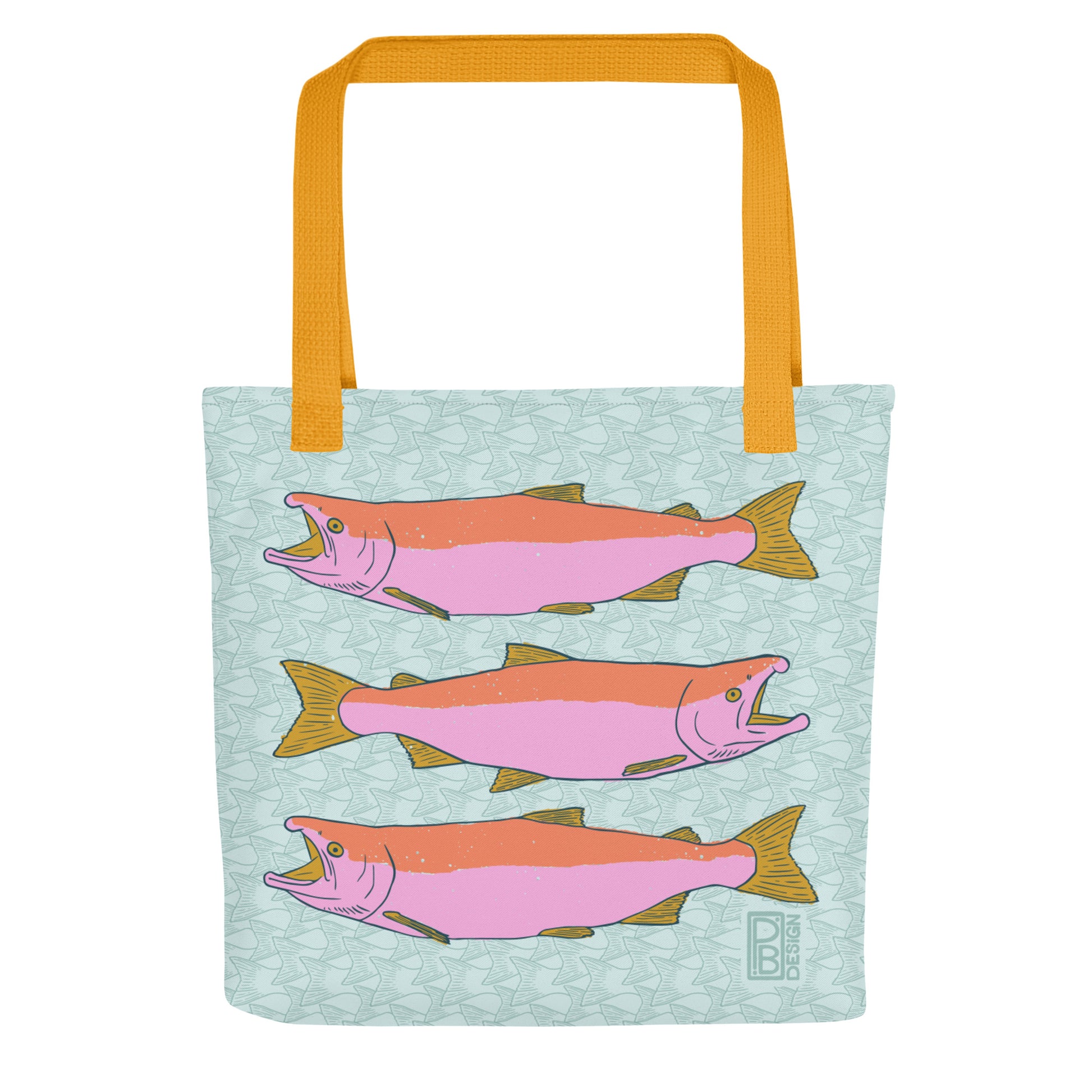This is a hand drawn salmon illustration featuring 3 large salmon on the front and back and a salmon tail pattern behind. It is printed on a spacious and trendy tote bag to help you carry around everything that matters.